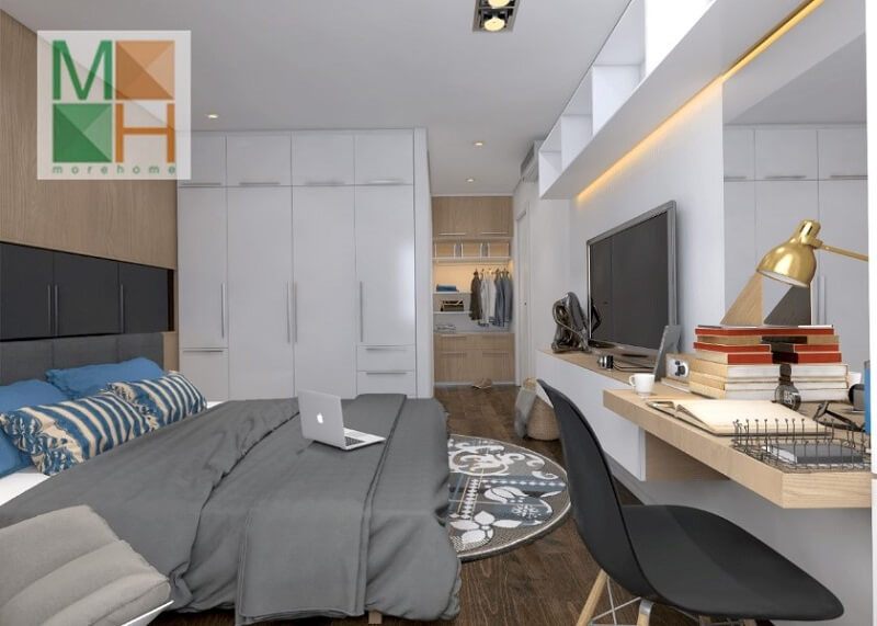 Phòng ngủ căn hộ trang trí nội thất hiện đại tiện lợi đối với không gian không quá rộng nhưng vẫn đáp ứng đầy đủ mục đích sử dụng của gia chủ.