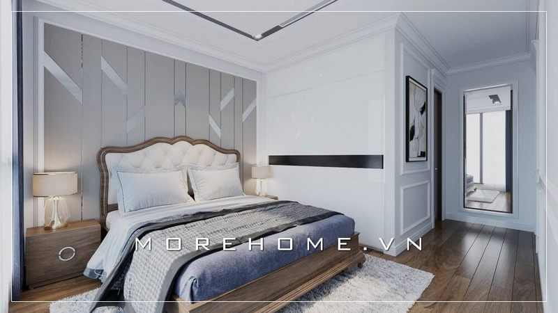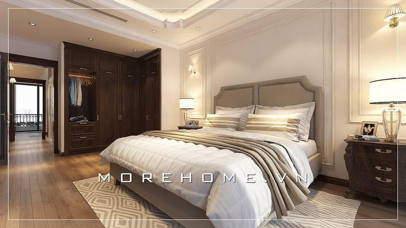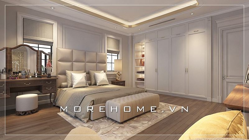 Ấn tượng với tủ quần áo tân cổ điển cánh kính thiết kế âm tường kịch trần tối giản diện tích căn phòng trở nên gọn gàng và rất hợp lý.