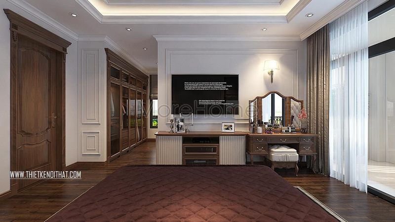 Mẫu cửa gỗ có kiểu dáng tân cổ điển đẹp làm cho phòng ngủ trở nên đẹp đẽ hơn.
