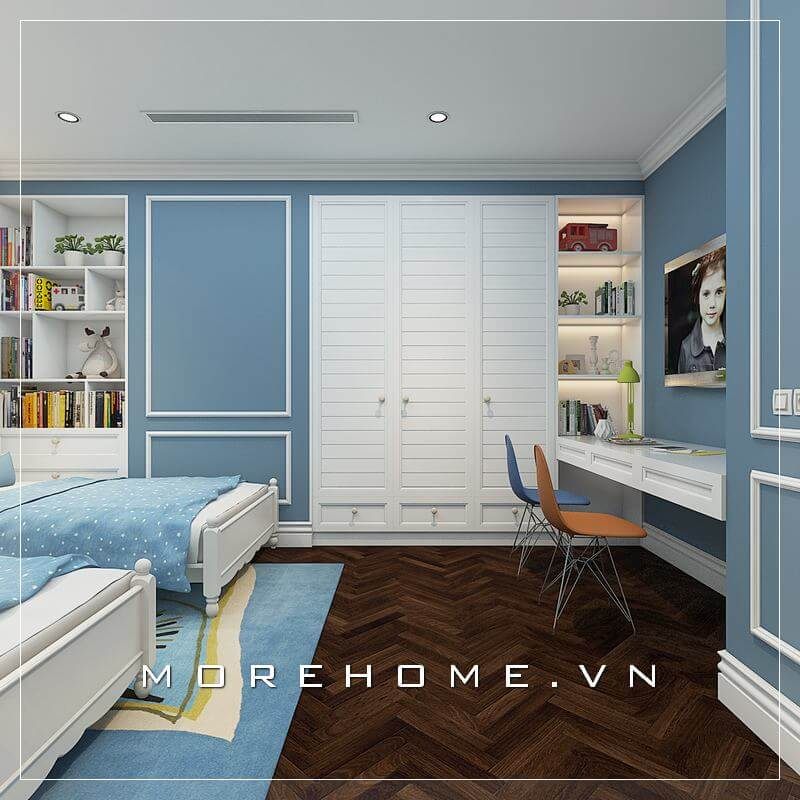 Mẫu thiết kế nội thất cho phòng ngủ của bé trai tại biệt thự theo phong cách tân cổ điển và cách bố trí nội thất khao học sẽ giúp không gian phòng ngủ trở nên gọn gàng hơn.